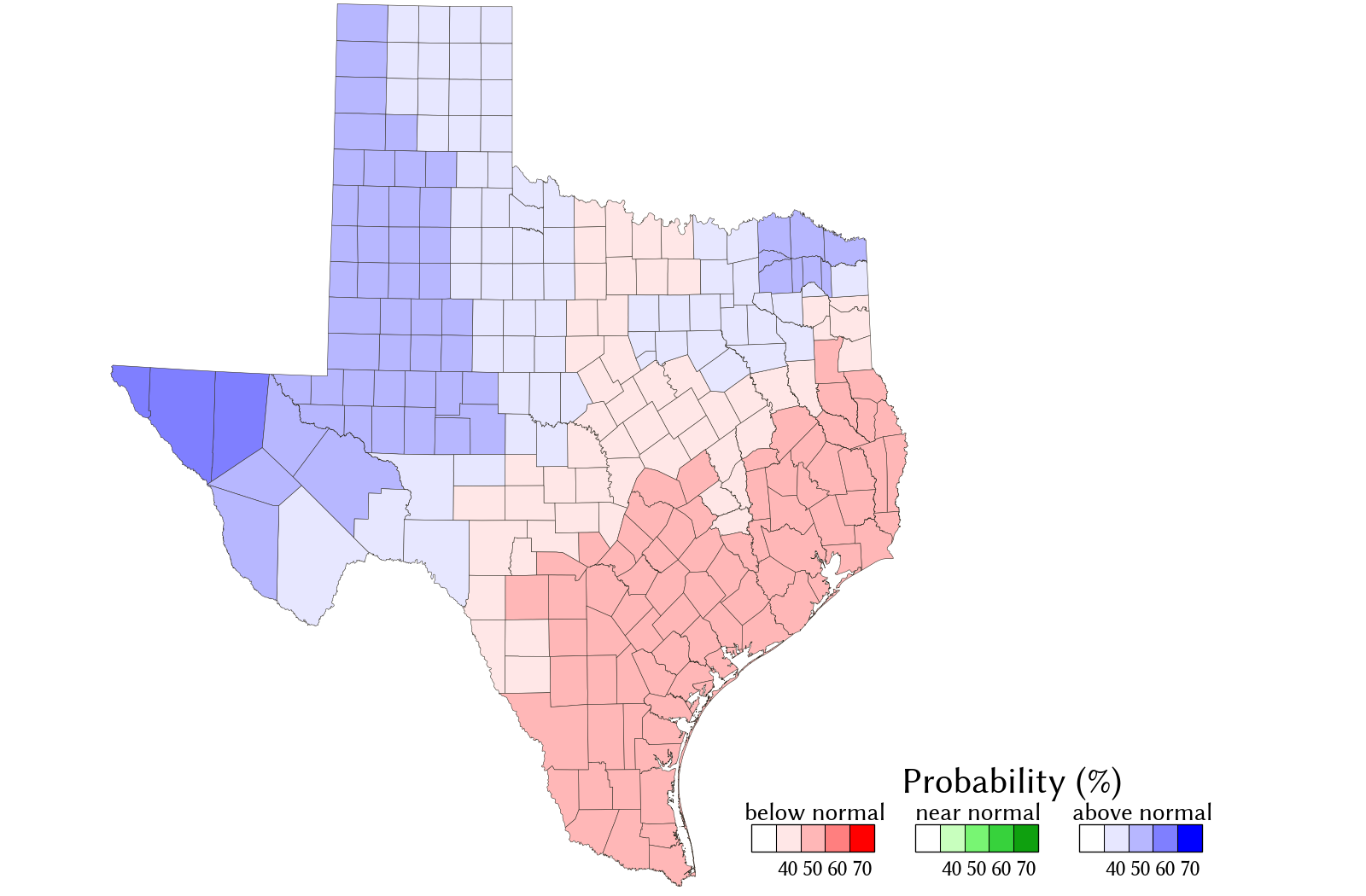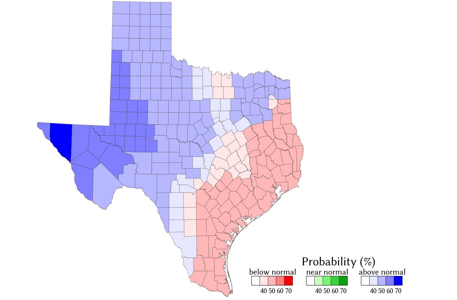 The May‒July seasonal rainfall forecast is an experimental forecast. It is primarily meant to be an information source to aid the implementation of drought contingency and emergency management plans. The TWDB provides information via this web site as a public service. Neither the State of Texas nor the TWDB assumes any legal liability or responsibility or makes any guarantees or warranties as to the accuracy, completeness, or suitability of the information for any particular purpose.