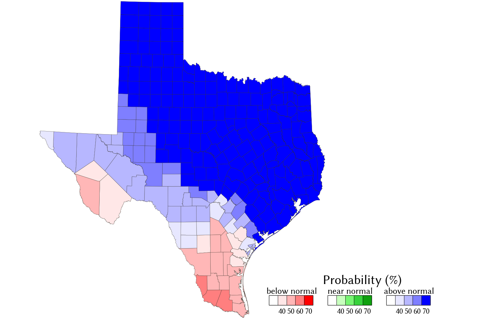 The May‒July seasonal rainfall forecast is an experimental forecast. It is primarily meant to be an information source to aid the implementation of drought contingency and emergency management plans. The TWDB provides information via this web site as a public service. Neither the State of Texas nor the TWDB assumes any legal liability or responsibility or makes any guarantees or warranties as to the accuracy, completeness, or suitability of the information for any particular purpose.