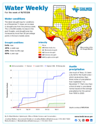 The Texas Water Development Board issues a monthly report describing water conditions across the state. These reports describe conditions at reservoirs, streamflow sites, and groundwater wells. Current and past reports can be found at the Texas Water Conditions page.Water Weekly